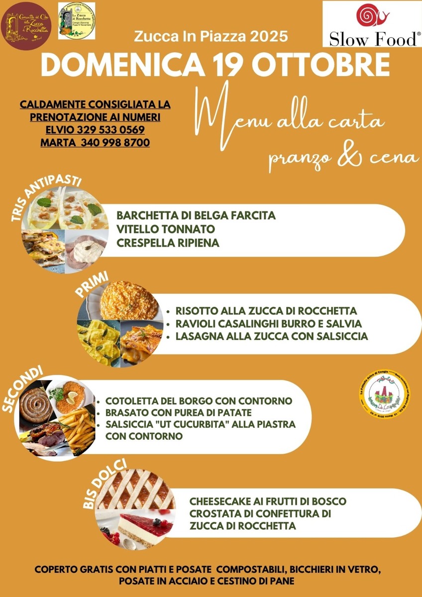 Dalle 12, presso il Palazucca, gli ospiti potranno pranzare scegliendo da un ricco menù alla carta. Regina assoluta sarà la Zucca di Rocchetta, protagonista di piatti come le lasagne zucca e salsiccia, la tradizionale salsiccia ut cucurbita, il risotto alla zucca e golosi dolci, tra cui la crostata con confettura.