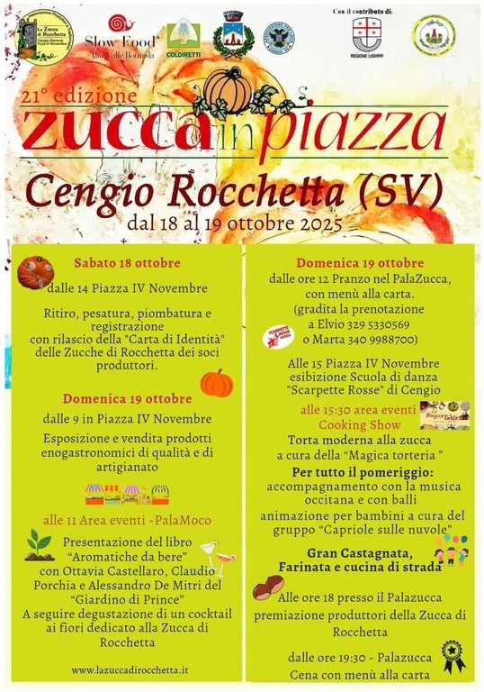 Il 18 e 19 ottobre si svolgerà la ventunesima edizione di “ZuccaInPiazza”, una manifestazione dedicata alla valorizzazione del territorio, alla salvaguardia della biodiversità e alla riscoperta delle tradizioni culinarie di questa terra di confine tra il mare e le Langhe. Una vera e propria festa, dove i soci produttori porteranno in piazza le meravigliose "zucche", prodotti di qualità del territorio.