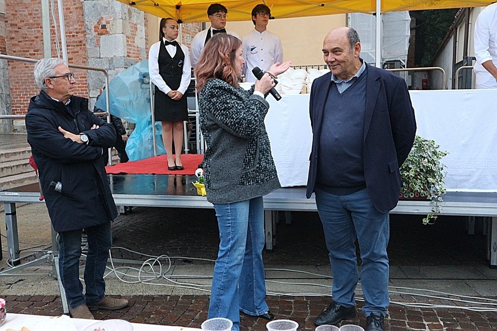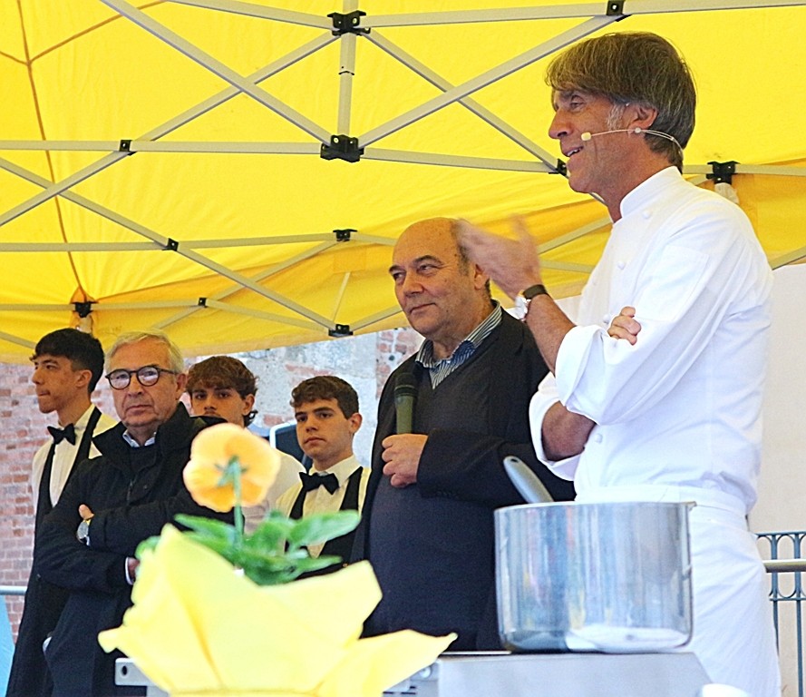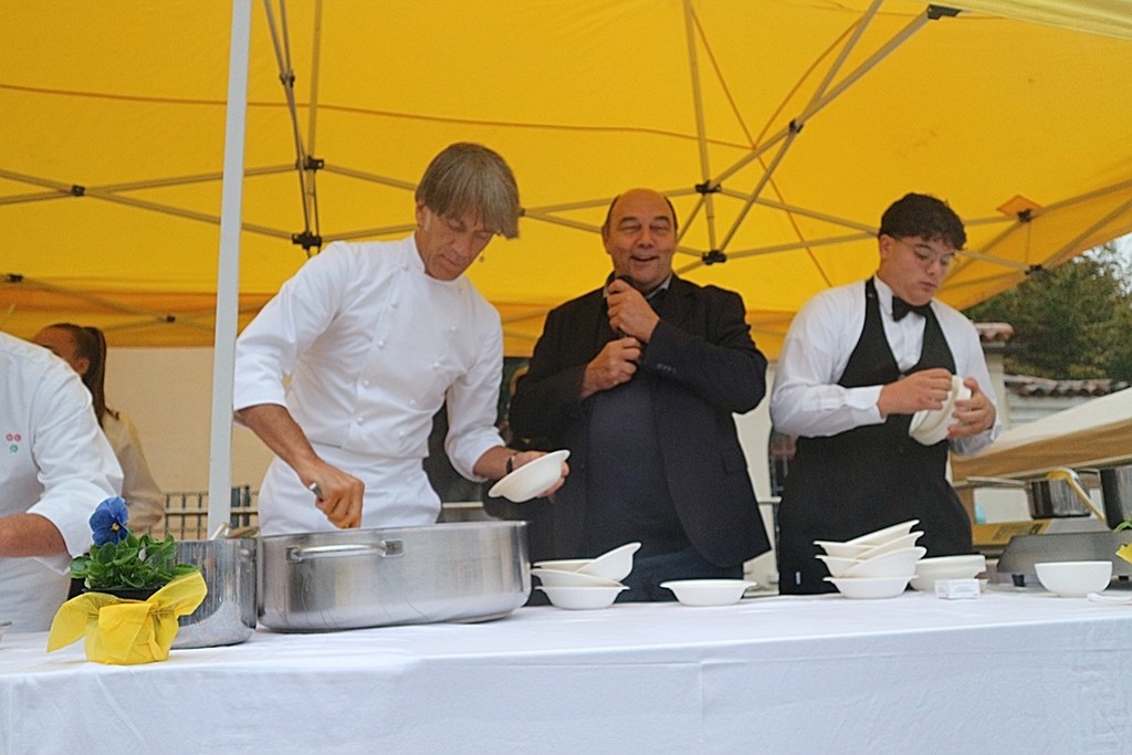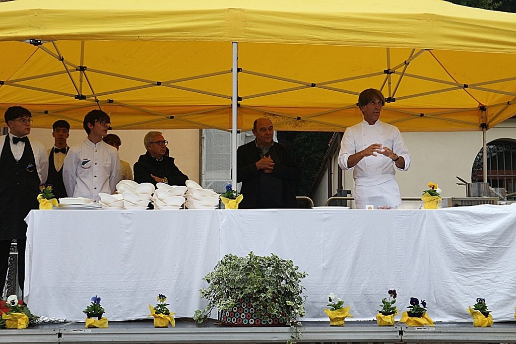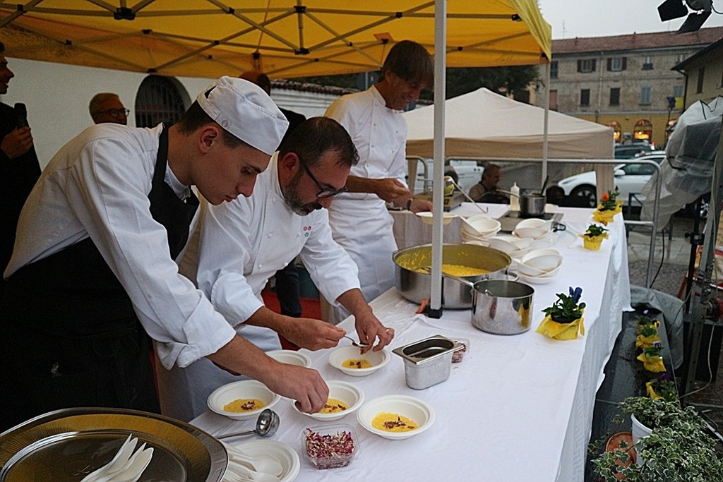 Oldani ha saputo coniugare tecnica e creatività, coinvolgendo anche i giovani studenti dell’Istituto Professionale Olmo che hanno servito con grande professionalità oltre 300 porzioni del risotto preparato dallo chef in diretta. Presenti allo show cooking anche il Sindaco ed il parroco, nei panni di inediti di critici gastronomici.