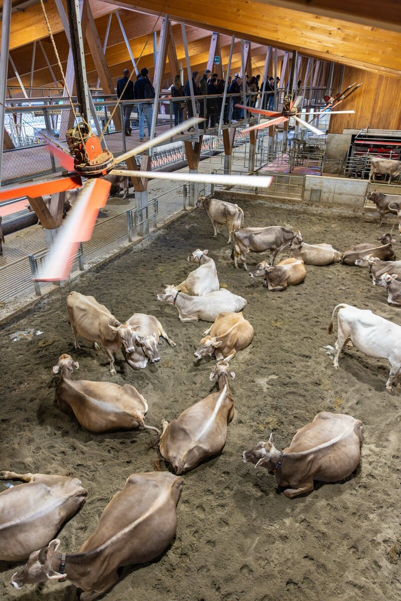 Dietro questa cucina c’è una fattoria viva. La stalla, completamente automatizzata, rappresenta un modello di benessere animale e innovazione: mucche allevate con cura, in un ambiente che garantisce condizioni ottimali, producono un latte di qualità eccelsa. Da qui nascono i formaggi che si possono assaggiare in tavola o acquistare nello spaccio aziendale: dai caprini freschi dal sapore delicato, ai taleggi affinati dalla personalità intensa, fino agli erborinati che esprimono complessità e profondità. È la prova tangibile che la filiera corta, quando è seguita con passione e rigore, diventa garanzia di eccellenza.