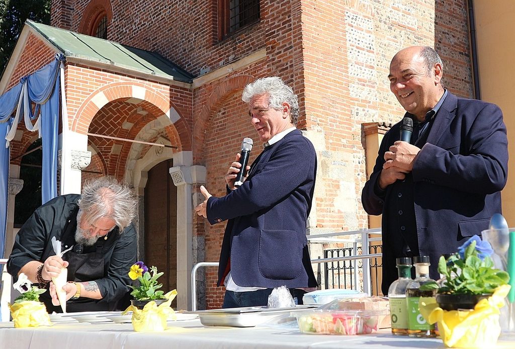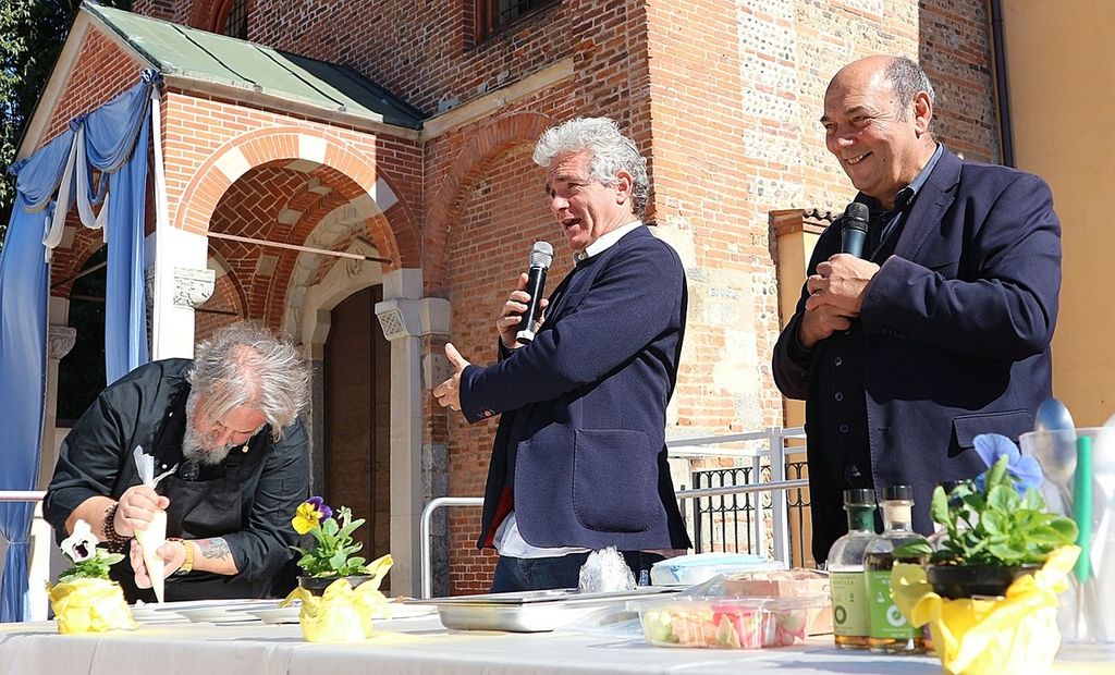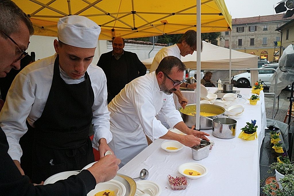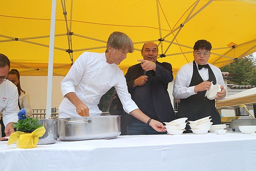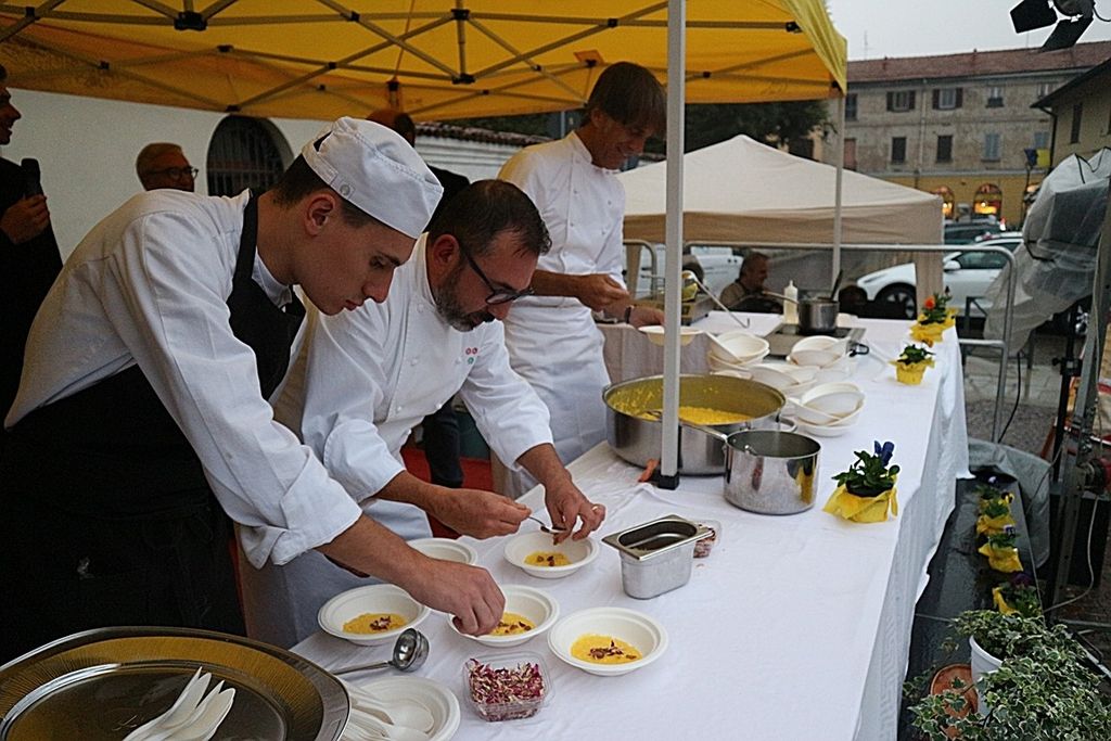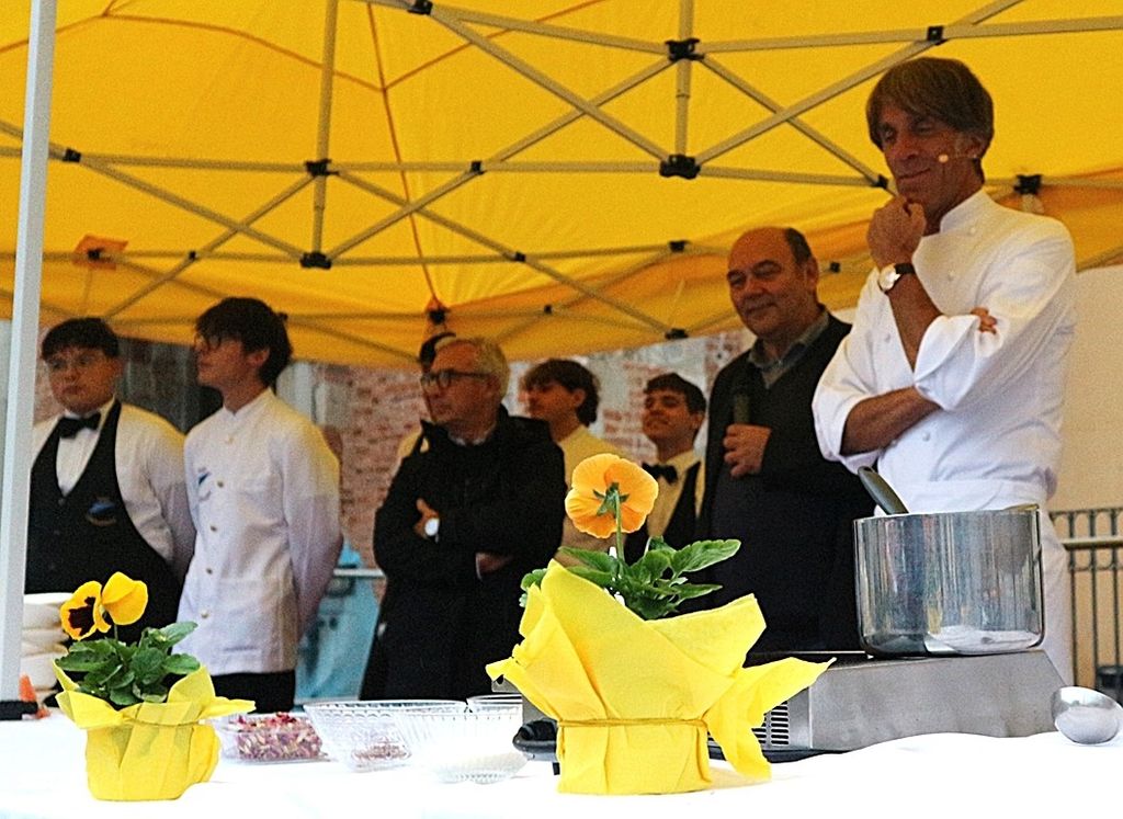 A rendere ancora più speciale l’evento è stata la presenza dello chef stellato Davide Oldani, ambasciatore della cucina italiana contemporanea, che ha saputo fondere tecnica e spontaneità in uno show cooking affollatissimo. Nonostante la pioggia, centinaia di persone hanno assistito alla sua performance, durante la quale, insieme agli studenti dell’Istituto Professionale Olmo, ha preparato e servito oltre 300 porzioni del suo risotto ai fiori, tra sorrisi e applausi.