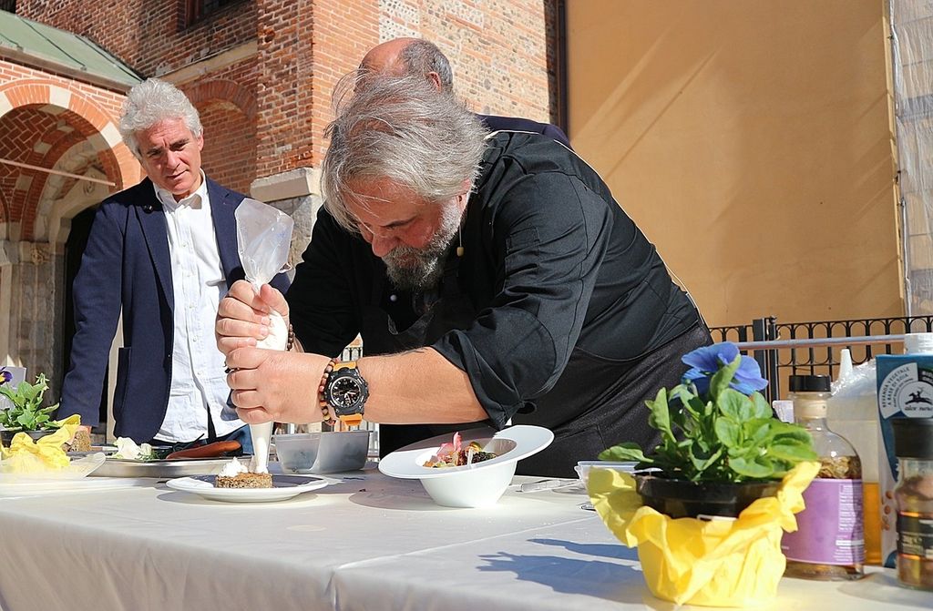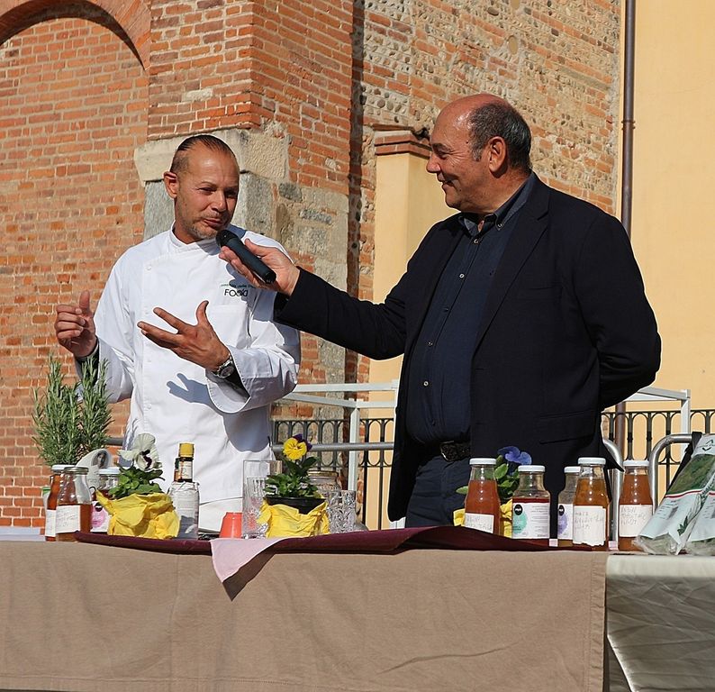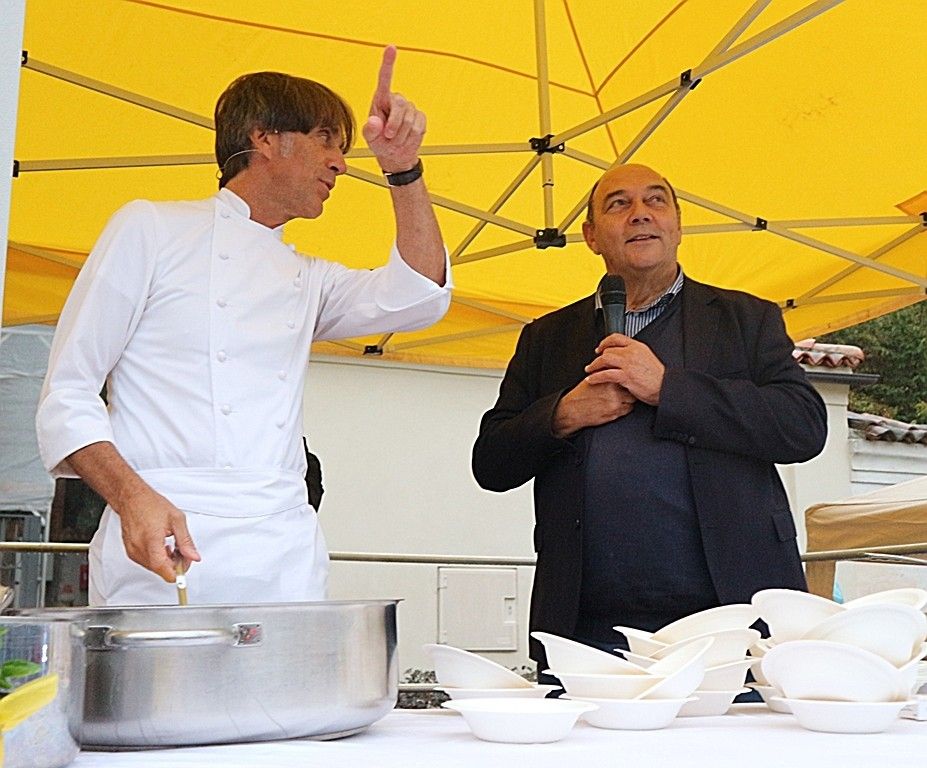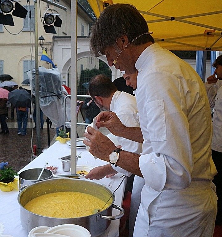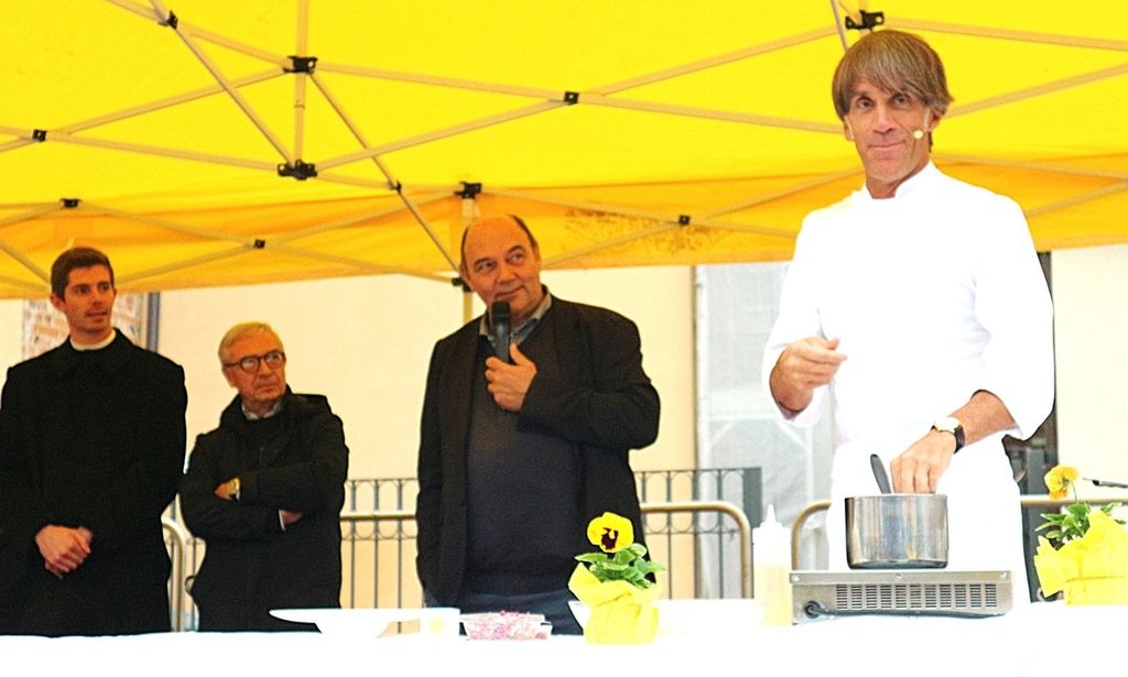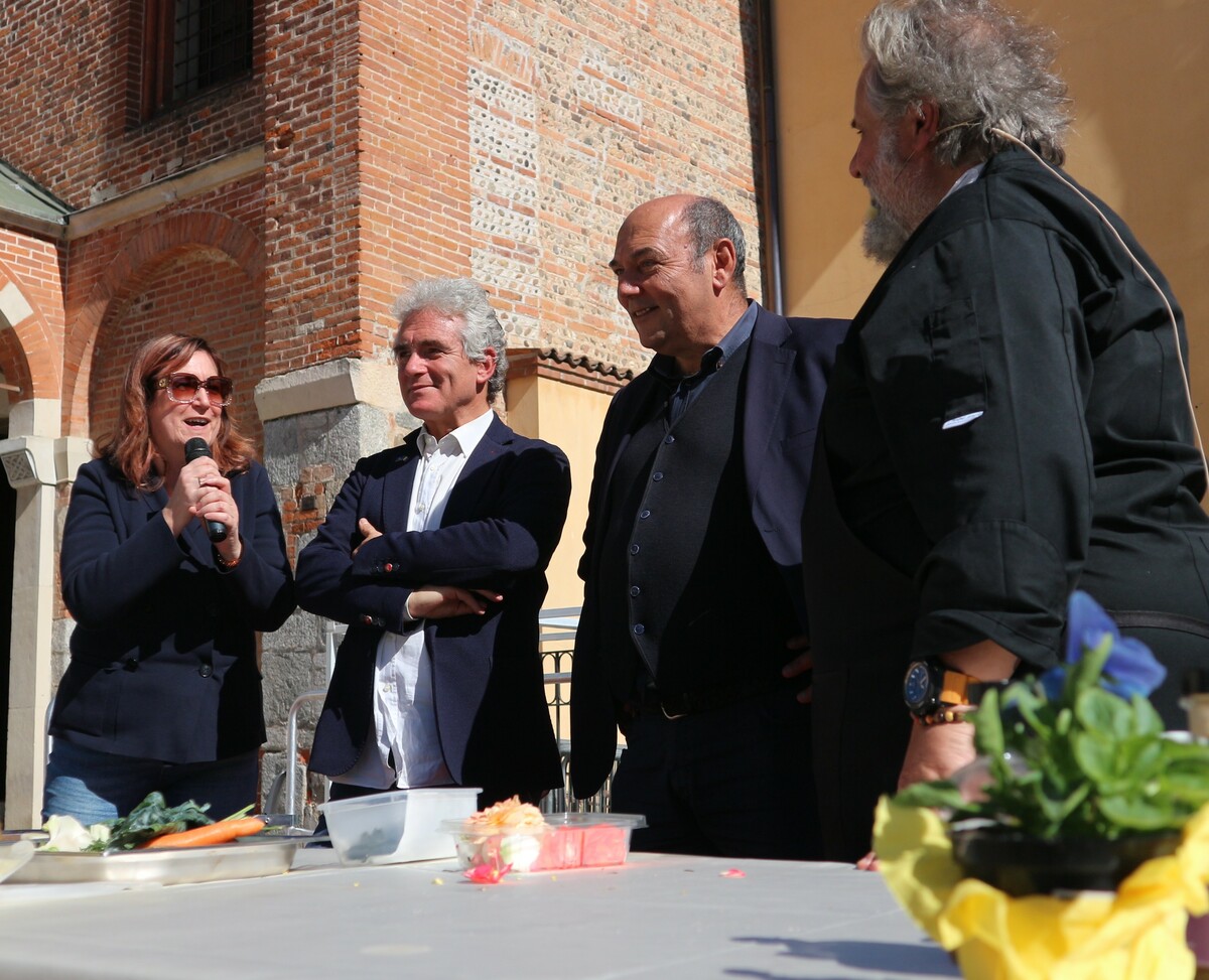 A rendere ancora più speciale l’evento è stata la presenza dello chef stellato Davide Oldani, ambasciatore della cucina italiana contemporanea, che ha saputo fondere tecnica e spontaneità in uno show cooking affollatissimo. Nonostante la pioggia, centinaia di persone hanno assistito alla sua performance, durante la quale, insieme agli studenti dell’Istituto Professionale Olmo, ha preparato e servito oltre 300 porzioni del suo risotto ai fiori, tra sorrisi e applausi.