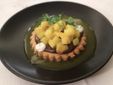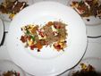 L’Antipasto ha stupito i presenti con un cestino di pasta sfoglia ripieno di hummus al basilico e verdure arrostite, con germogli e fiori eduli, tra cui tagete e calendula, per un perfetto equilibrio tra gusto, colore e leggerezza, ancora una volta accompagnato dal Marengo DOC Acquesi.