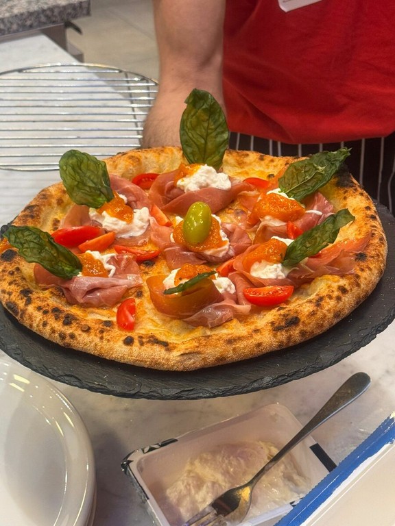 A convincere tutti è stata la Fenice, una pizza gourmet buona e bella (l'estetica era la prima dote richiesta) composta da una base di mozzarella con crudo di Parma 18 mesi, stracciatella, marmellatina di pomodorini gialli fatta in casa, basilico cristallizzato, pomodorini rossi oltre a quel tocco in più di sapienza artigiana di Giuseppe Frau.