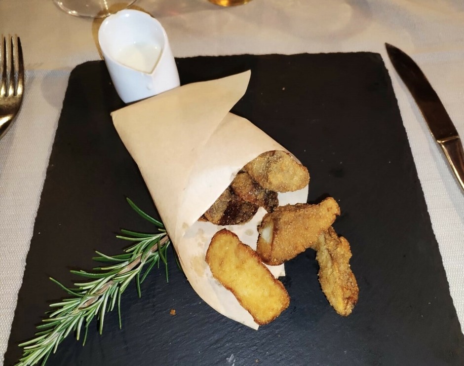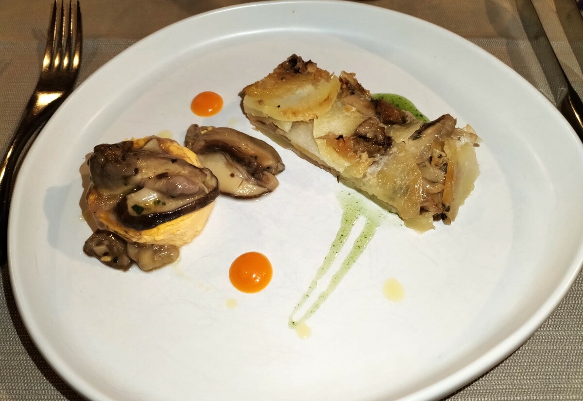 L’esperienza si apre con un antipasto d’autunno che racchiude in sé colori e profumi del bosco: porcini trifolati accostati a un morbido flan di zucca, porcini crudi in insalata croccante e i classici porcini fritti con crema di Parmigiano. Un trittico elegante e goloso, che nel piatto racconta la stagione come una tavolozza calda di tonalità e consistenze — un piacere per gli occhi prima ancora che per il palato.