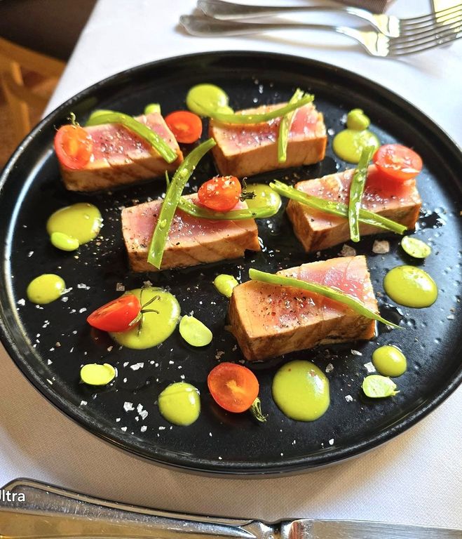 Tra gli antipasti la tartare di tonno rosso con salsa di soia (18,50 €) o il guazzetto di cozze e vongole con crostini (15,50 €). Fra i primi: ravioli di borraggine, zuppetta di pescato, paste artigianali al ragù di scorfano e salicornia (18,50 €) o al sughetto di totani locali e zucchine trombetta (16,50 €).