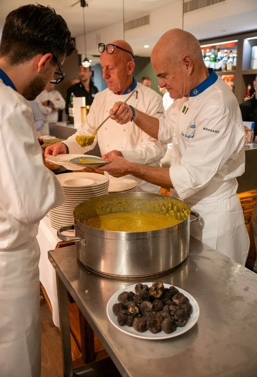 Il Risotto du Prince Carlo, firmato dallo chef Enrico Derflingher, ha rappresentato uno dei momenti più celebrati della serata: un riso Carnaroli riserva, impreziosito da gorgonzola DOP, tartufo nero e pistilli di zafferano. Un piatto sontuoso, esaltato dal Johannisberg “Mi-Doux”, che ne ha amplificato la cremosità e la ricchezza aromatica.