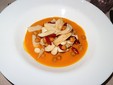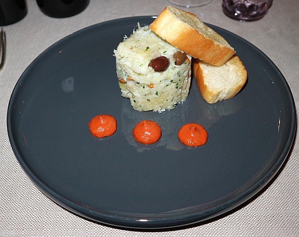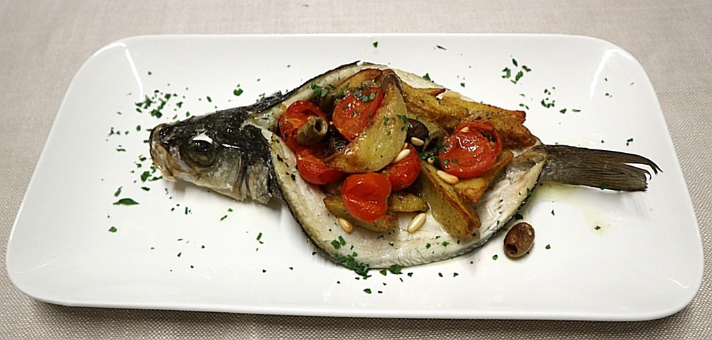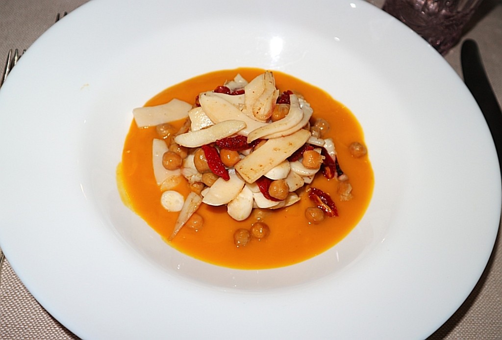 Fra gli antipasti: Polpo tiepido con patate di Calizzano, cuore di bue, olive e pinoli, piatto mediterraneo, fresco, equilibrato. Mantecato di baccalà alla ligure con pane casareccio, olive, pinoli tostati e crema di pomino arrostiti, un’interpretazione moderna del brandacujun; un piatto tra tradizione e creatività come le Seppie spadellate con ceci, crema di zucca al lemongrass e datterini confit e un delicato Vitello tonnato tradizionale a bassa temperatura.