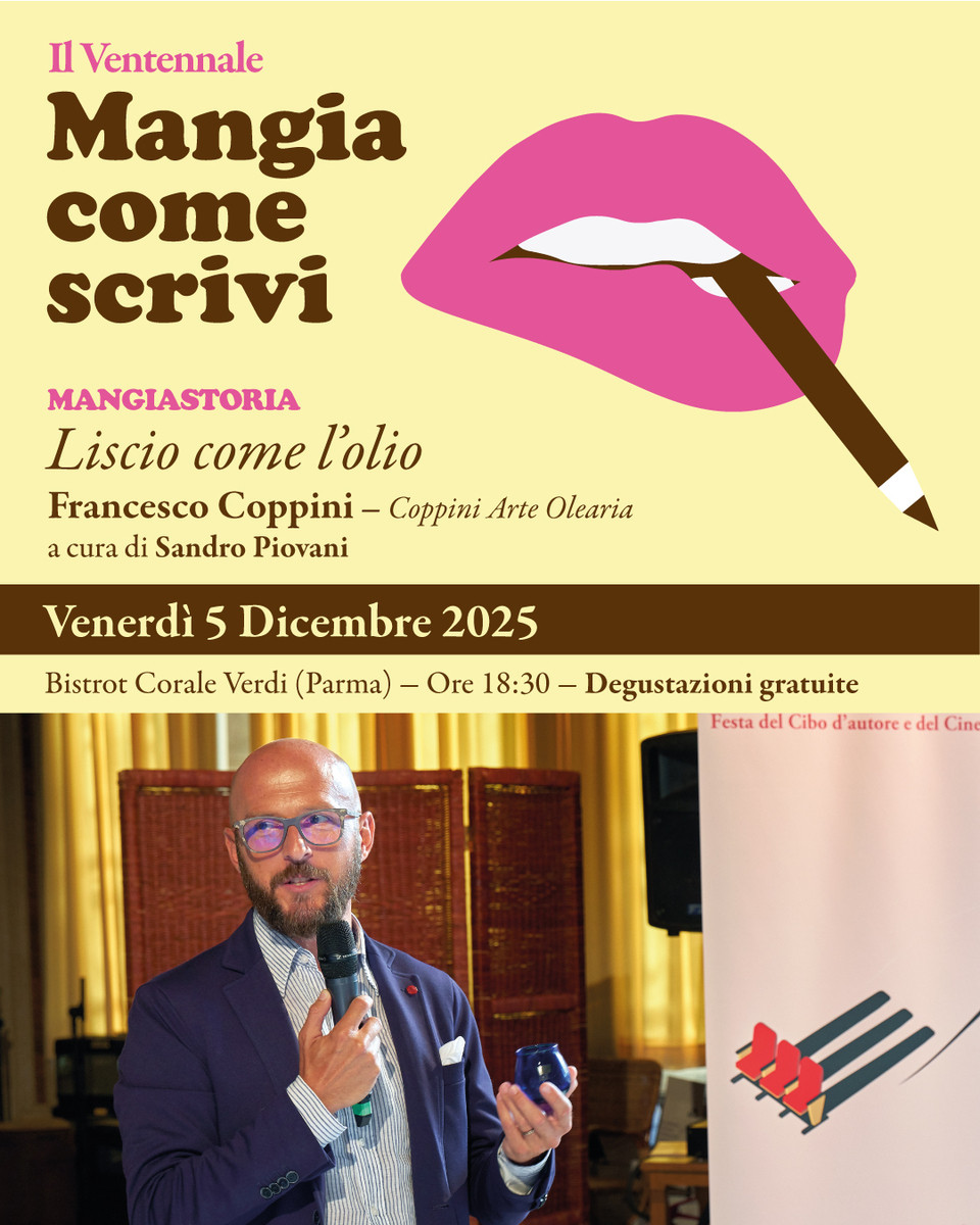 La serata — a ingresso libero — prenderà il via alle 18.30 con uno show cooking gratuito abbinato alla Mangiastoria “Liscio come l’olio” condotta da Francesco Coppini di Coppini Arte Olearia. Per l’occasione verrà presentato il Novolivo, il primo olio della nuova campagna, seguito da una degustazione guidata con altre sorprese. Le Mangiastorie sono curate dal giornalista Sandro Piovani, responsabile dell’inserto Gusto della Gazzetta di Parma.