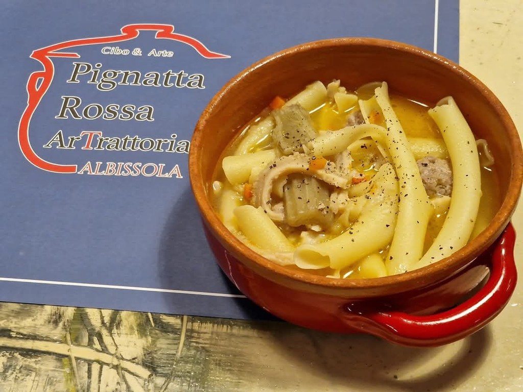 Il cuore della serata è però la grande protagonista del Natale savonese: la Minestra di Natale, proposta nella sua antica ricetta. Un piatto che è molto più di una tradizione: un rito familiare che si rinnova. Nel piatto trovano posto il brodo di cappone, la trippa, la salsiccia, il cardo e i celebri Natalini, la pasta lunga tipica delle feste. Una combinazione ricca, sontuosa, che racconta l'identità di una cucina nata tra mare e entroterra, sobria ma capace di sorprendere con profondità e intensità di sapori.