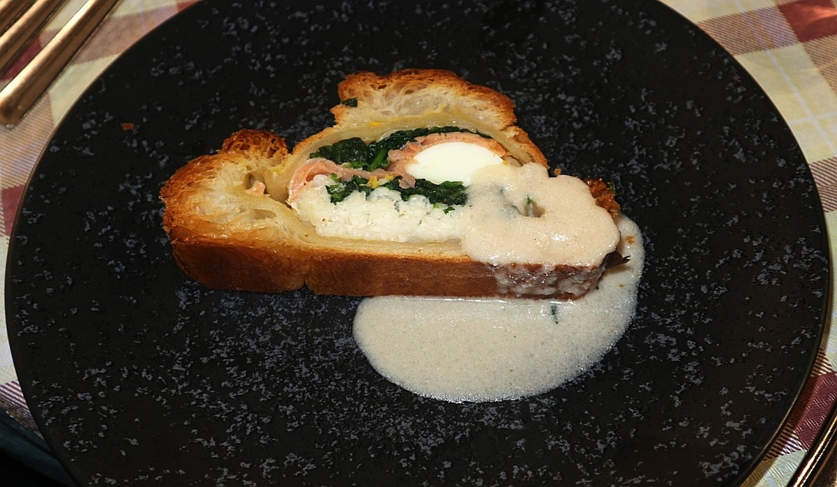 La serata si apre con il Kulibiak, un omaggio alla tradizione russa: un piatto celebrato nelle grandi festività e descritto da Auguste Escoffier nella sua Guida alla grande cucina. Una torta salata avvolta in un guscio dorato di pasta sfoglia, che racchiude salmone, riso, uova sode e spinaci. Un intreccio raffinato di sapori antichi interpretati con tecnica e sensibilità contemporanea.