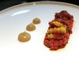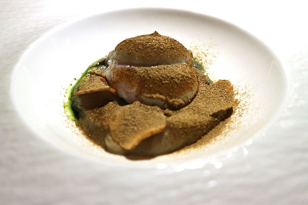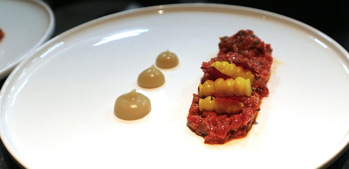Gli antipasti firmati da Theodor Falser hanno aperto la serata con profondità e rigore: la Tartare di manzo alpino, spuma al burro nocciola, rape nere e grosny e la Crema di topinambur, panna agra, uovo a bassa temperatura e polvere di porcini hanno evocato con forza il paesaggio montano, restituendone complessità e carattere.