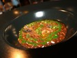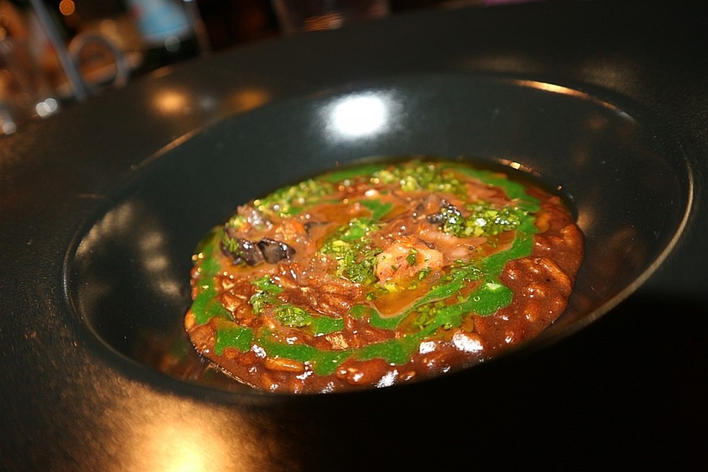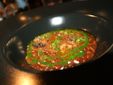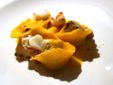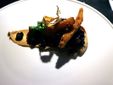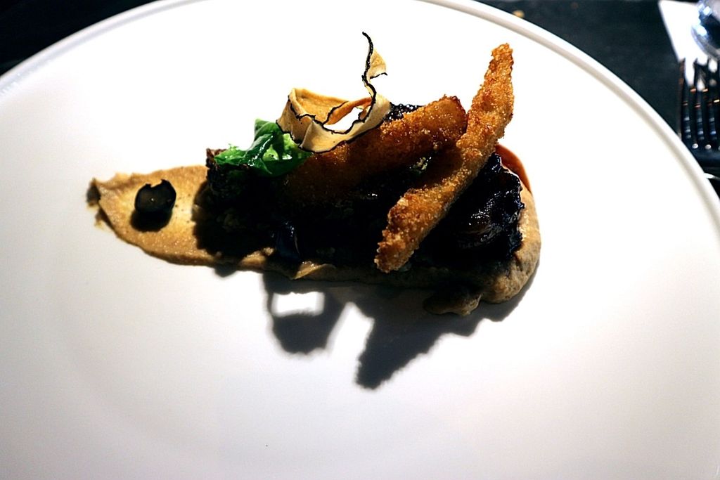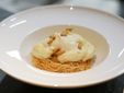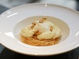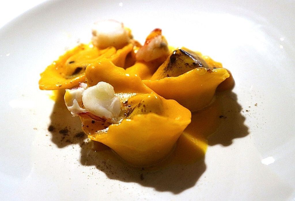 Il viaggio gastronomico ha preso avvio con una delicata amuse-bouche: seppia cotta a bassa temperatura con crema di panissa, un assaggio misurato ed elegante che ha immediatamente tracciato la rotta della serata, fondendo mare e tradizione ligure e predisponendo il palato a un racconto fatto di dialoghi e contaminazioni.