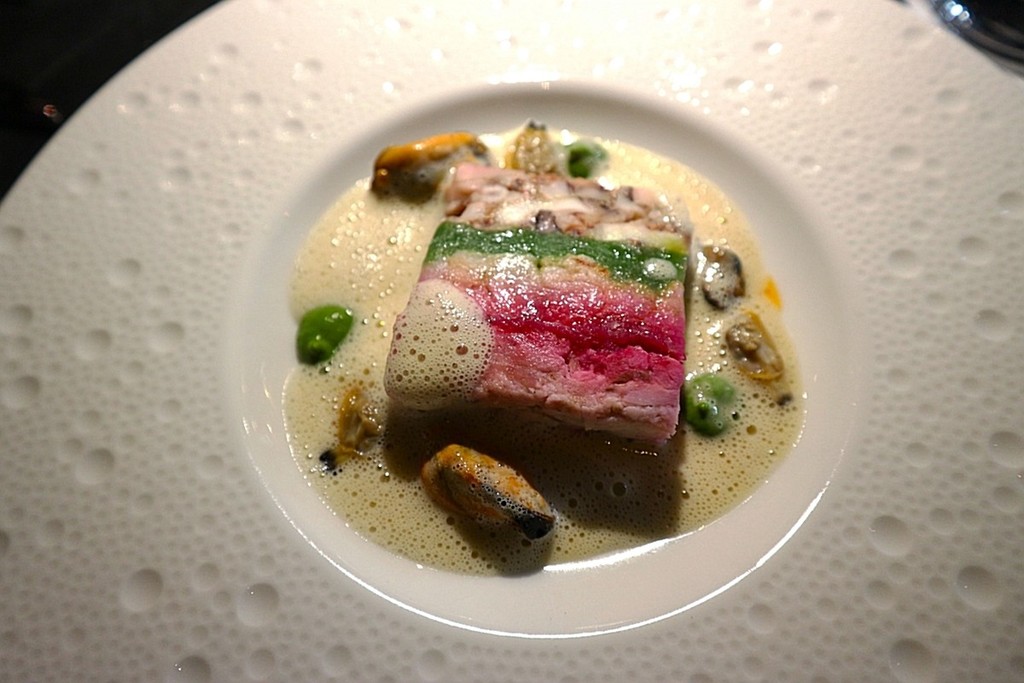 A dialogare con essa, la Terrina di Cappon Magro con bagnetto verde e burro bianco al Moscato dello chef residente Alessandro Schiavon, raffinata rivisitazione di un grande classico ligure. Il tutto accompagnato da un Pinot Nero elegante e misurato.