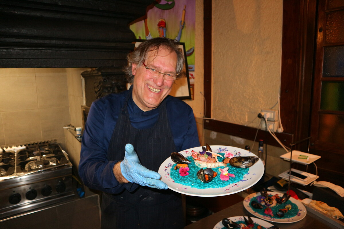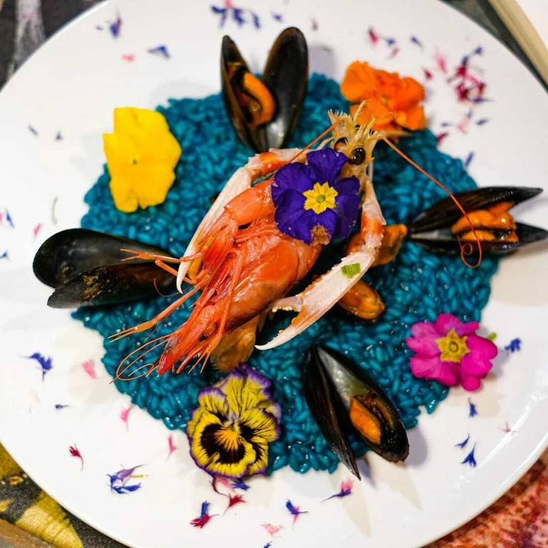 C’è un risotto che sembra dipinto più che cucinato. È il Risotto Blu ai Frutti di Mare e Fiori Eduli, firmato dallo chef Mauro Granone, anima creativa dell’Osteria Pescheria degli Artisti di Albissola Marina (SV). Un piatto dedicato a Frida Kahlo, donna e artista capace di fondere forza, fragilità e colore in un’unica, potente visione. Qui il mare diventa tela. Il riso Carnaroli cuoce lentamente in una bisque intensa di pescatrice, scampi e cozze, mentre l’agerato regala una sorprendente colorazione blu naturale, profonda e luminosa, che richiama i fondali marini. I profumi sono delicati ma riconoscibili: la tulbaghia, con le sue leggere note d’aglio, accompagna i frutti di mare senza sovrastarli, esaltandone la dolcezza. Il piatto si completa con cozze appena aperte, scampi al vapore e una decorazione floreale che è parte integrante del gusto: nasturzio, begonia e viole aggiungono freschezza, leggere sfumature aromatiche e una dimensione visiva fortemente evocativa. La mantecatura finale con burro d’alpeggio e Parmigiano Reggiano chiude il cerchio, regalando cremosità ed equilibrio.