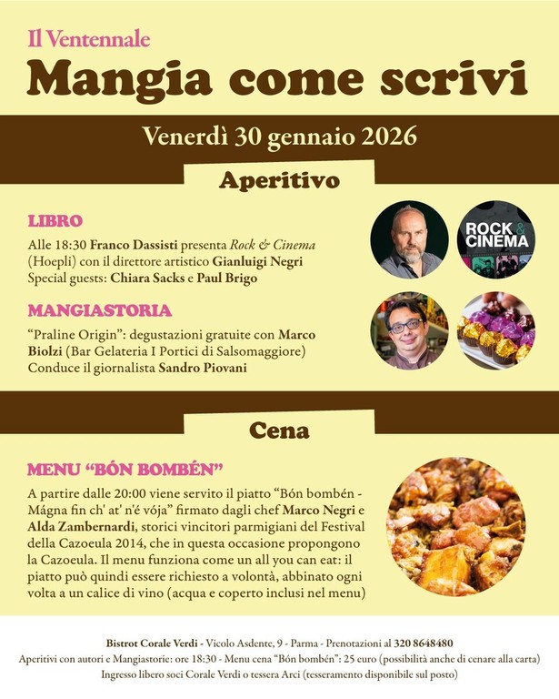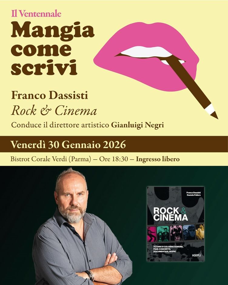 Dopo il grande successo del decennale di Mangiamusica, celebrato a dicembre al Teatro Magnani di Fidenza, la stagione parmigiana di Mangia come scrivi riparte con un appuntamento speciale dedicato alle sette note. Venerdì 30 gennaio, al Bistrot Corale Verdi di Parma, va in scena “Rock & Cinema”, una serata a ingresso libero che intreccia parole, musica e sapori.