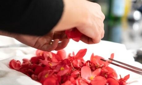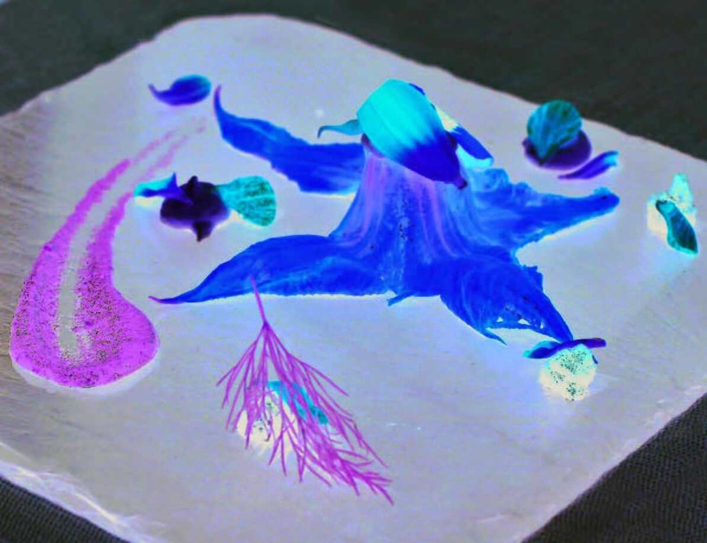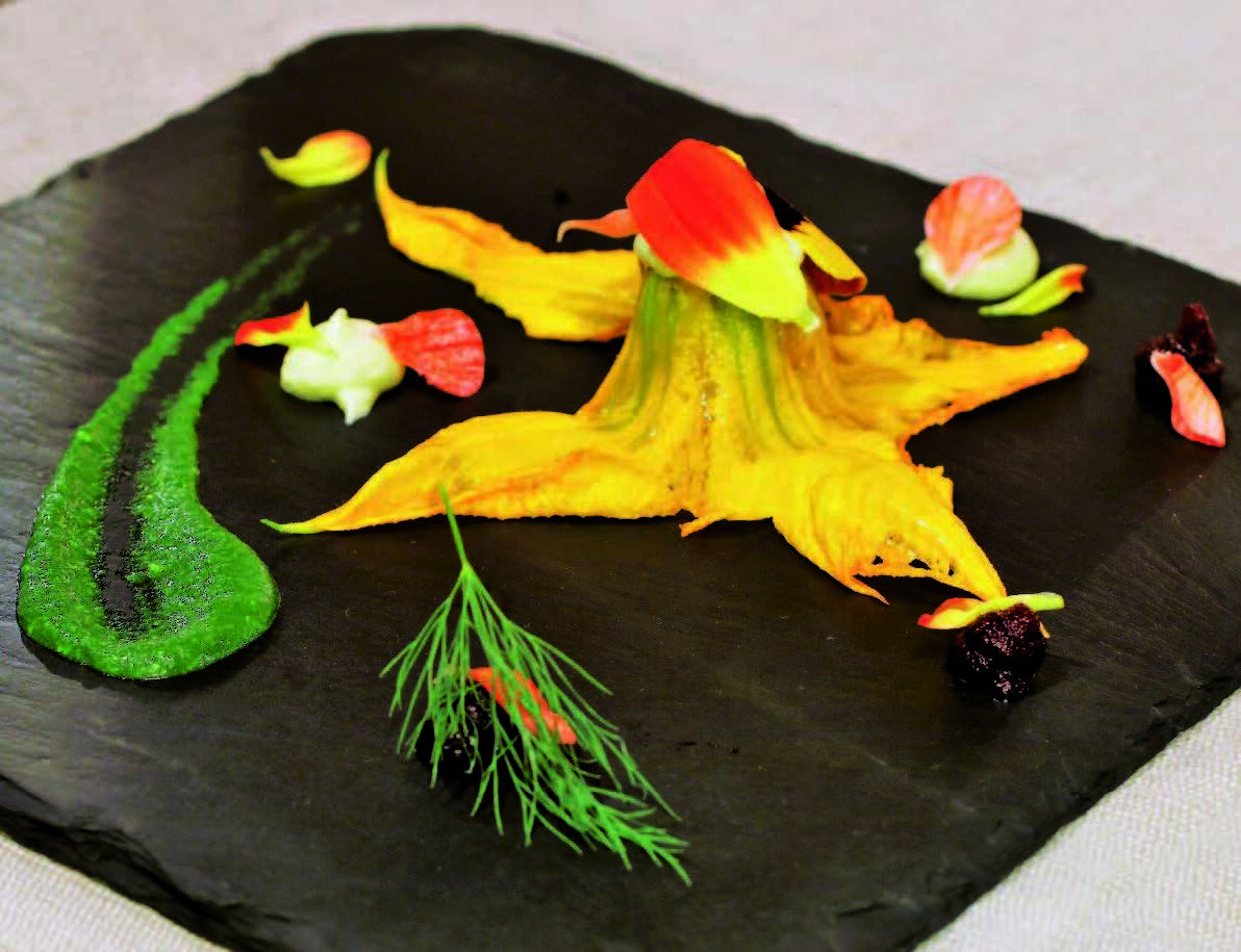 Farcire i fiori con la crema di trombetta. Completare il piatto disponendo la clorofilla, il purè di barbabietola, l’aneto e i fiori eduli rimanenti.