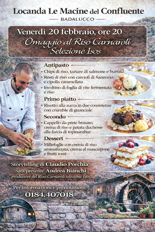 La prima tappa, venerdì 20 febbraio alle ore 20.00, è dedicata all’Omaggio al Riso Carnaroli Selezione Isos. Lo chef costruisce un percorso che attraversa tecniche e consistenze, trasformando il chicco in elemento strutturale dell’intero menù. L’apertura propone chips croccanti con tartare di salmone e burrata, seguite da un rösti con carciofi di Sanremo e cipolla caramellata e da un involtino in foglia di vite fermentata. Il risotto alla zucca, giocato su due consistenze e arricchito dal contrasto del guanciale, conduce al cappello da prete brasato, sostenuto da crema di riso e patate duchesse al topinambur. Chiude una millefoglie con crema aromatizzata al riso, mascarpone e frutti rossi.