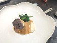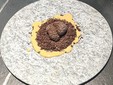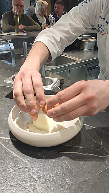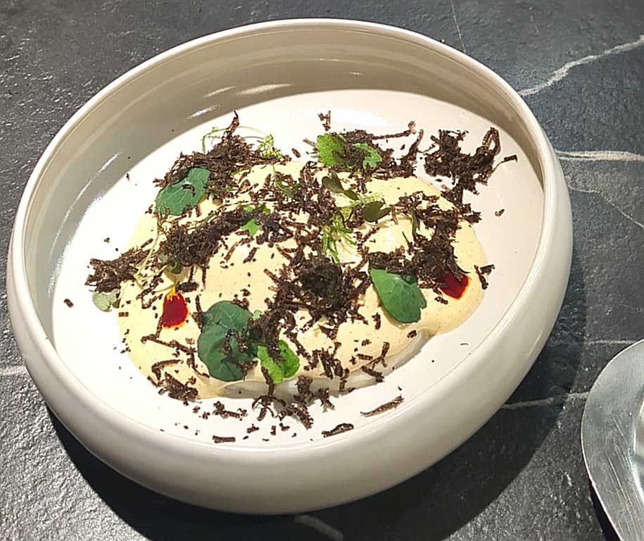 L’apertura è stata un “uovo cotto a bassa temperatura con crema di sedano rapa e topinambur, arricchito da un’olandese alla nocciola Piemonte”. Un piatto in cui la dolcezza dei vegetali e la grassezza dell’uovo hanno fatto da spalla alla profondità olfattiva del tartufo. Una proposta apparentemente semplice e lineare, nella quale ogni elemento manteneva la persistenza aromatica.