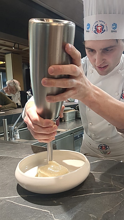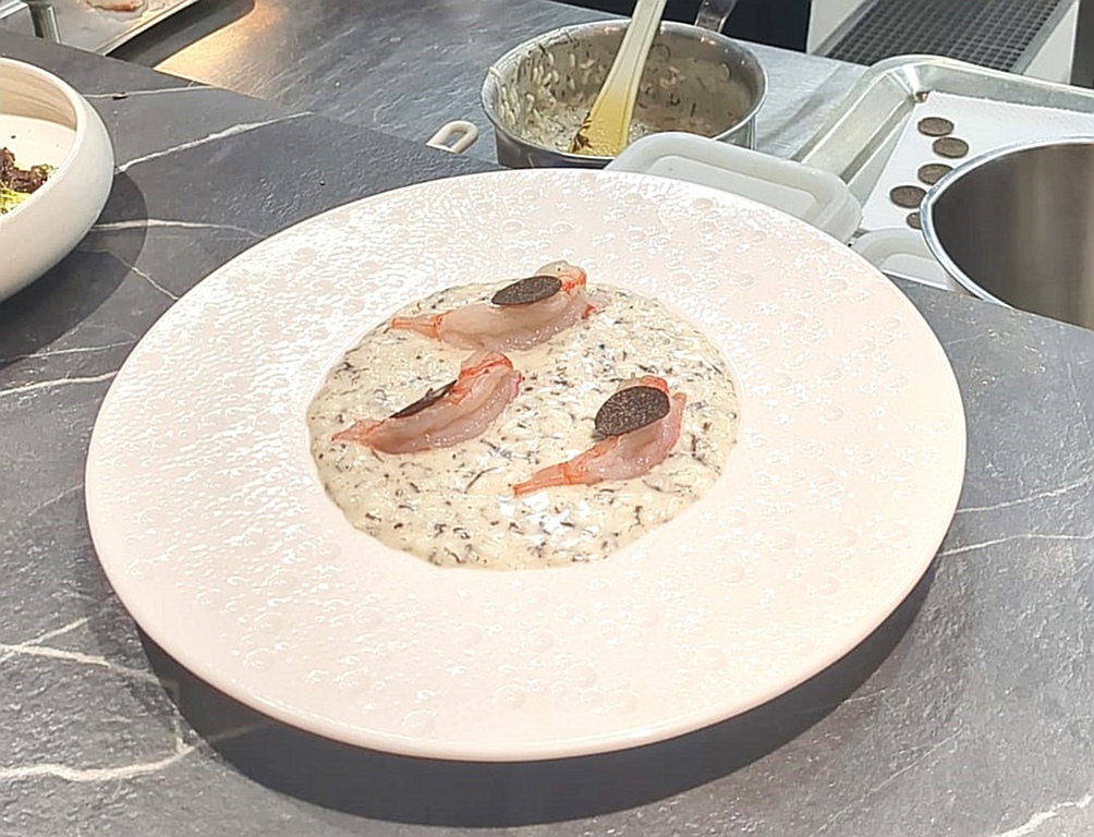 Il testimone è poi passato allo chef resident per il “risotto Carnaroli, mantecato alla robiola di Roccaverano con gambero rosso di Sanremo scottato”. Una preparazione tecnicamente impeccabile, riso tostato a secco e cotto senza brodo né sfumatura al vino, che ha permesso alla cremosità acida della robiola di esaltare il tartufo, trovando nel gambero appena scottato il perfetto contrappunto marino.