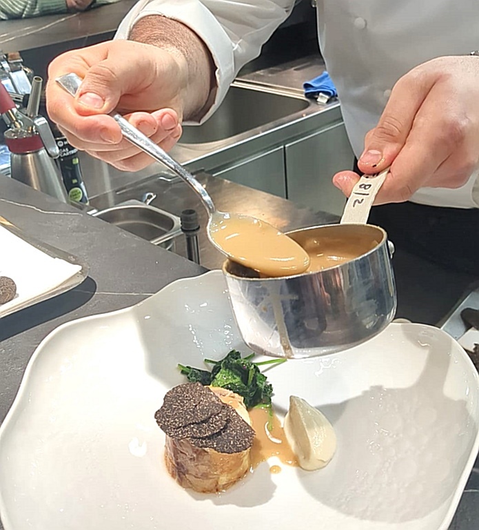 Ancora più audace la portata principale: “una rollatina di faraona ripiena di scampi e tartufo, servita con purea di cavolfiore e jus di faraona”. Un riuscito dialogo tra terra e mare, in cui la faraona, lavorata in forma di rollatina, è diventata supporto neutro e raffinato per il ripieno di scampi e tartufo, mentre la purea di cavolfiore ha introdotto una componente morbida e vegetale che ne ha bilanciato la densità aromatica. Lo spinacino saltato ha aggiunto freschezza e il jus di faraona ha riportato il piatto su un registro classico.