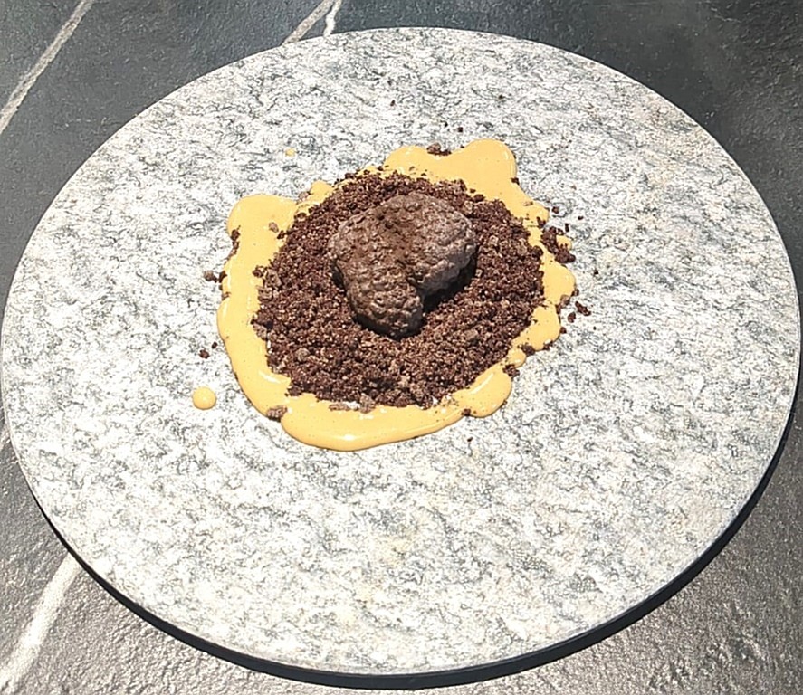 In chiusura, una proposta più concettuale con “ganache bianca, porcino, tartufo nero e caffè”. Un pre-dessert costruito su contrasti controllati: la dolcezza della ganache, la nota boschiva del porcino, la persistenza aromatica del tartufo e la chiusura amaricante del caffè. Una composizione giocata sulla contaminazione tra codici dolci e salati, capace di lasciare una traccia sensoriale più evocativa che descrittiva.