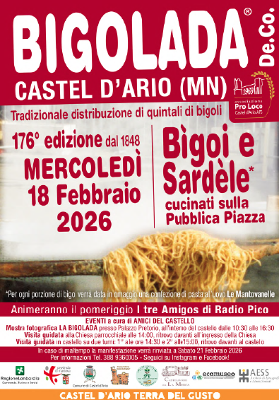 Mercoledì 18 febbraio 2026 Castel d’Ario rinnova uno degli appuntamenti gastronomici più longevi della pianura mantovana: la Bigolada De.Co., giunta alla 176ª edizione. Dalle 11 fino al pomeriggio la piazza diventa una grande cucina all’aperto dove si preparano quintali di bigoi com le sardèle, secondo una ricetta tramandata di generazione in generazione.
