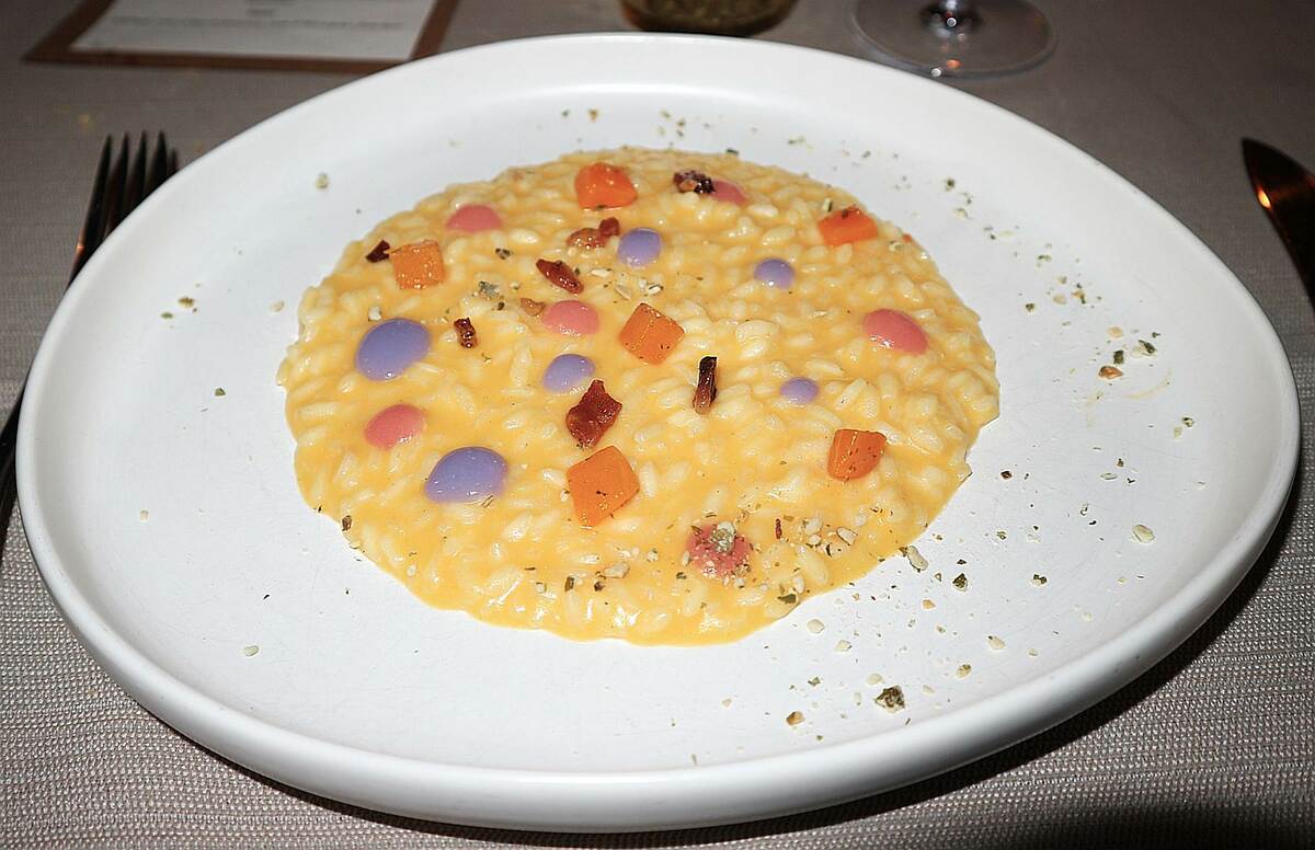 Il risotto alla zucca, giocato su due consistenze e sostenuto dal contrasto sapido del guanciale, ha rappresentato il cuore tecnico della serata.