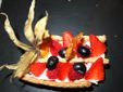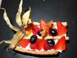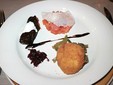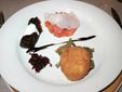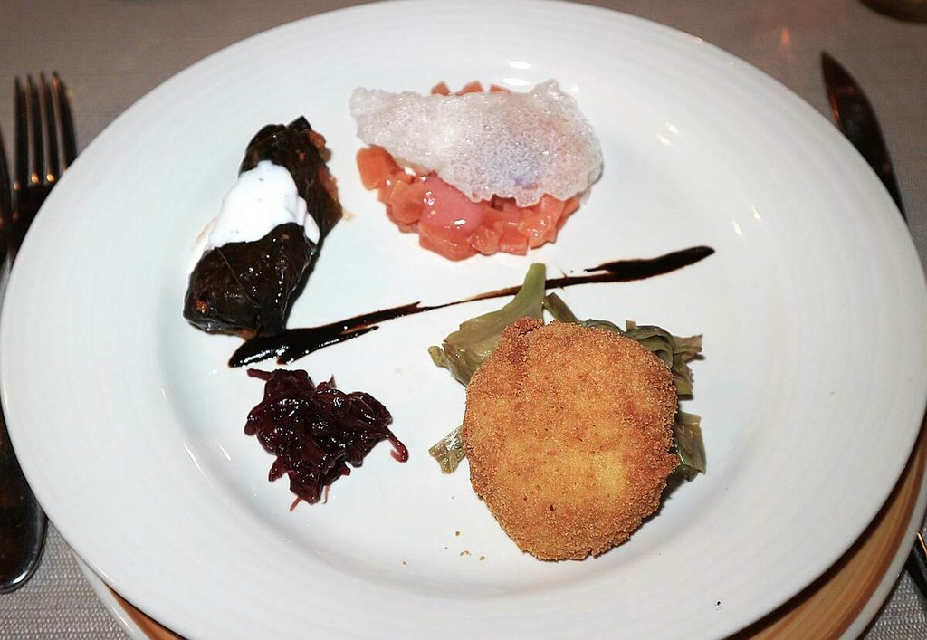 seguita da un tris di antipasti: chips di riso croccanti con tartare di salmone e burrata, rösti ai carciofi di Sanremo con cipolla caramellata e involtino in foglia di vite fermentata.