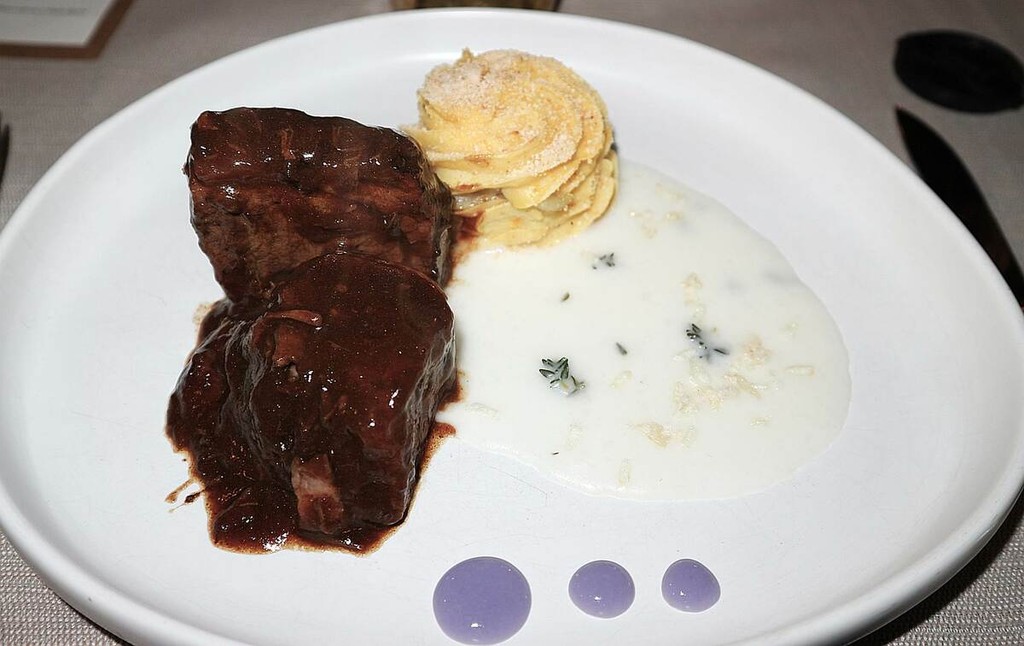 A seguire, cappello da prete brasato con crema di riso e patate duchesse al topinambur.