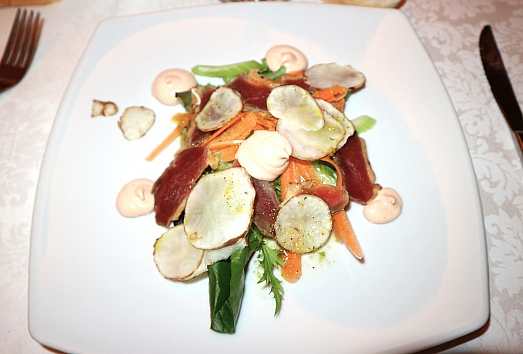 Antipasto: petto d’anatra confit con insalata