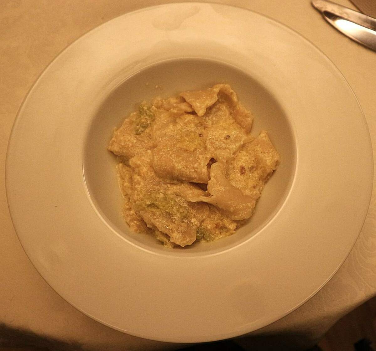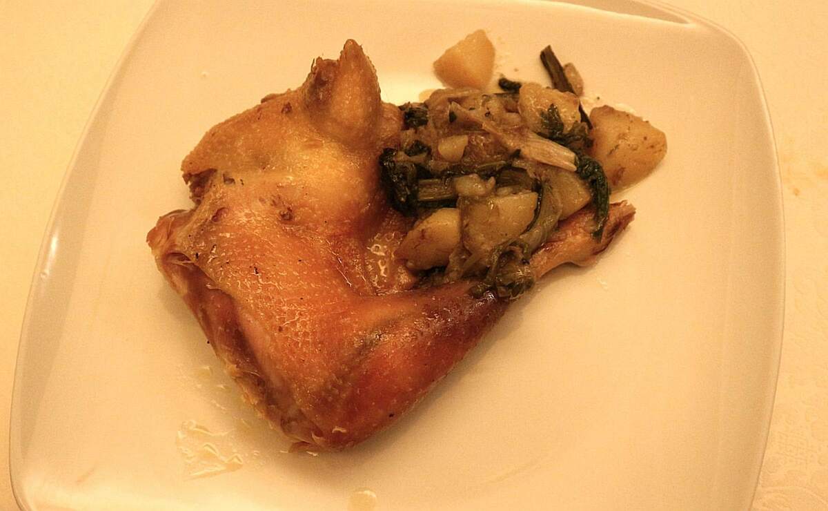 A seguire la Streppa e Caccia là, pasta fresca irregolare strappata a mano e condita con essenzialità, quindi la Gallina stufata con agliè, accompagnata da patate alle erbe amare, esempio perfetto di cucina contadina lenta e saporita.