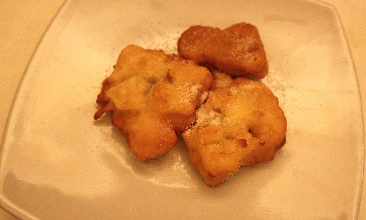 In chiusura i Friscio de mè, frittelle di mele della tradizione, dolce semplice e familiare che riporta alla memoria la cucina domestica delle vallate.