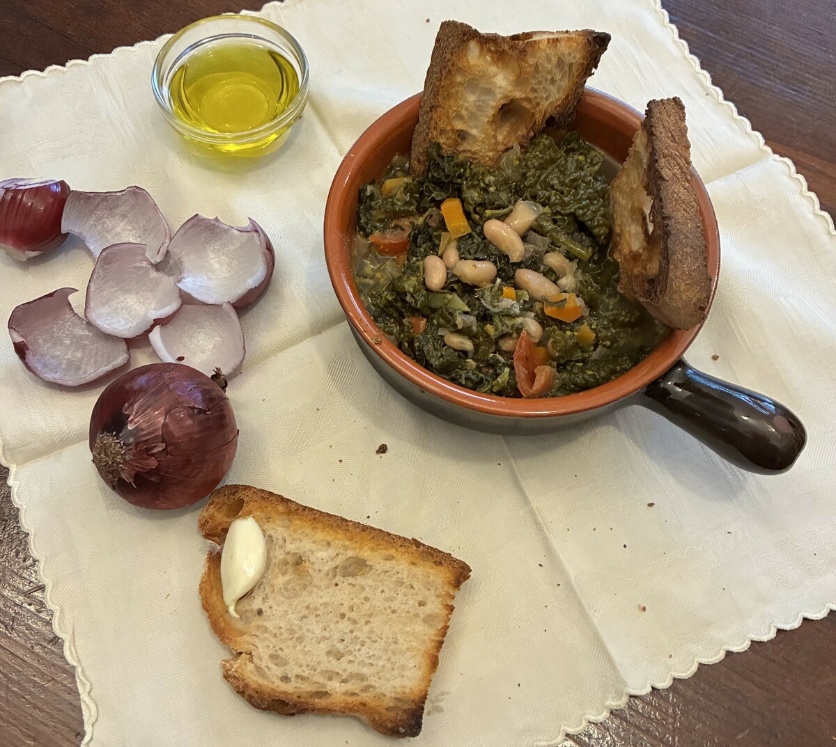 LA RIBOLLITA – Non esiste una ricetta codificata, perché le varianti apportate sono molte e variano da zona a zona, ma fondamentalmente alla base c’è il soffritto in olio EV0 di abbondante cipolla carote e sedano; quando appassito si aggiungono i fagioli (se secchi vanno lasciati preventivamente a mollo 24 ore). La più classica delle versioni chiede i cannellini, ma il gusto personale consente anche altre varietà, successivamente si mettono in pentola le foglie di cavolo nero a pezzetti unitE a verdure dell’orto, facendo attenzione alle proporzioni: 2/3 di cavolo nero ed 1/3 di altre (bietole, spinaci ecc). Un arricchimento apprezzato vede l’aggiunta dell’osso del prosciutto con residui di carne attaccata, o meglio ancora tocchi di cotenna di maiale che renderanno la zuppa ancora più gustosa . La prima bollitura vede tempi da una a due ore, dopo viene lasciata fuori dal fuoco a riposare. Il giorno dopo viene utilizzata come da precedente descrizione versandola nei cocci sopra pane abbrustolito e agliato portandola a nuova cottura e facendo possibilmente creare la crosticina data dal pane che frigge, l’aggiunta di olio a crudo deve considerarsi come il suggello divino, L’utilizzo al posto del cucchiaio delle sfoglie di cipolla che vengono masticate insieme faranno provare delle sensazioni forti che rimandano ad una cultura di cucina contadina ormai sempre più rara.