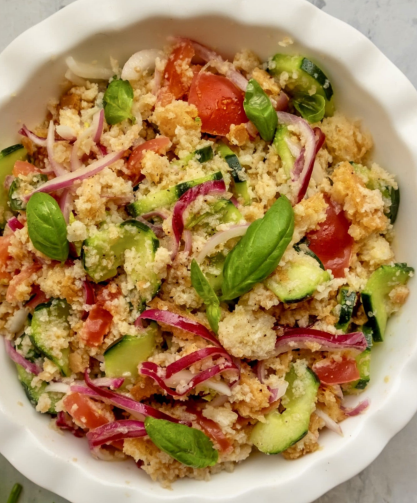 LA PANZANELLA – E’ considerata la versione estiva; ingrediente fondamentale il pane toscano sciapo, magari utilizzando quello avanzato raffermo. Viene lasciato a mollo in acqua leggermente acidulata con aceto fino a quando sarà possibile strizzarlo bene bene e creando una base ben divisa e sbriciolata, si aggiungono poi gli ingredienti di cui i fondamentali sono la cipolla, il basilico, il cetriolo e il pomodoro, ma la fantasia e la disponibilità individuale faranno il resto. Sale e olio EVO completeranno il piatto che richiede di riposare qualche ora per essere gustato al meglio, ricordandoci che nelle famiglie contadine veniva preparato in grandi quantità per essere consumato anche in diversi giorni.